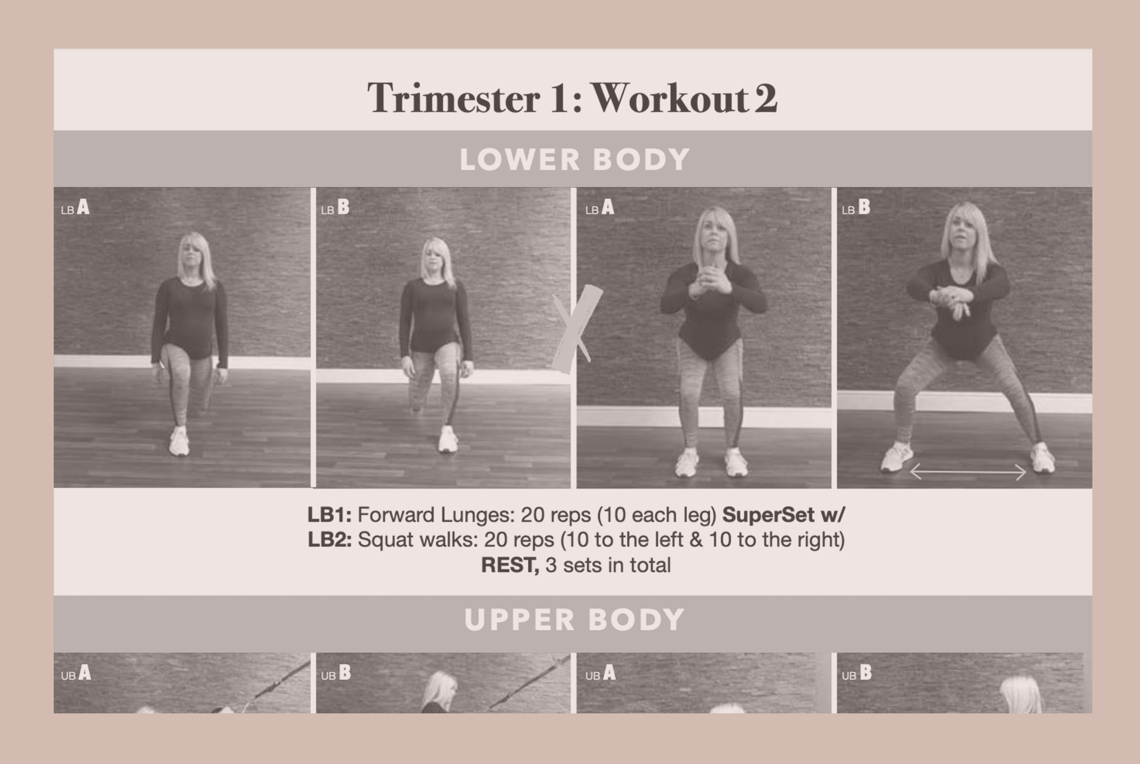 The e-book includes a warm up video, and then 2 full body workouts for each trimester.